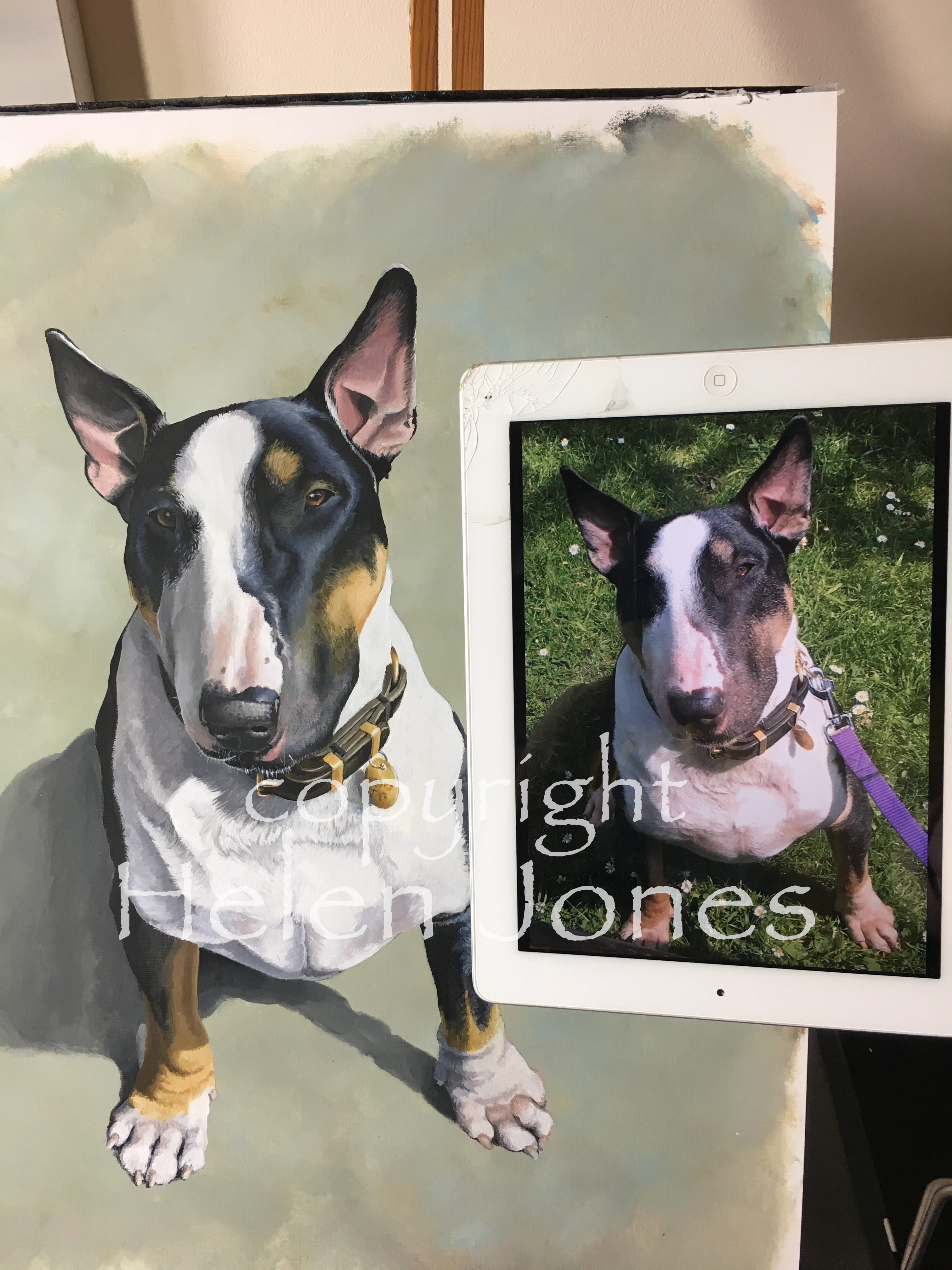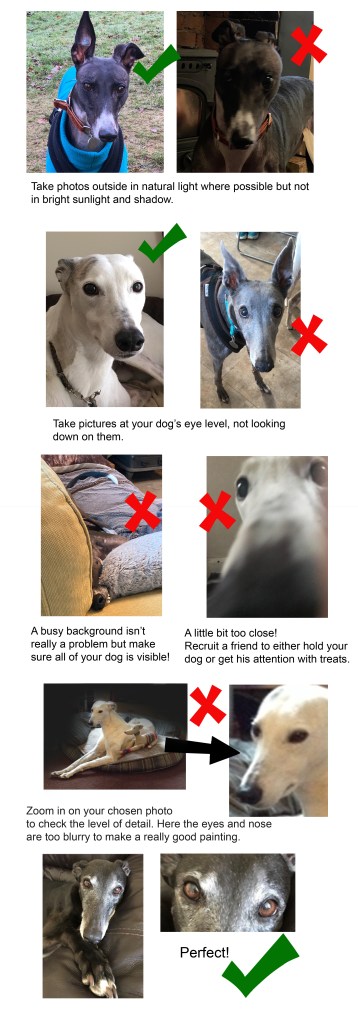 I work either with acrylic paints or graphite pencil, depending on the customer’s preference. As pencil is quicker to work with, it is a cheaper option. A painting of a single pet generally takes between 15 and 30 hours, you are commissioning a bespoke, original work of art, not a mass-produced print.